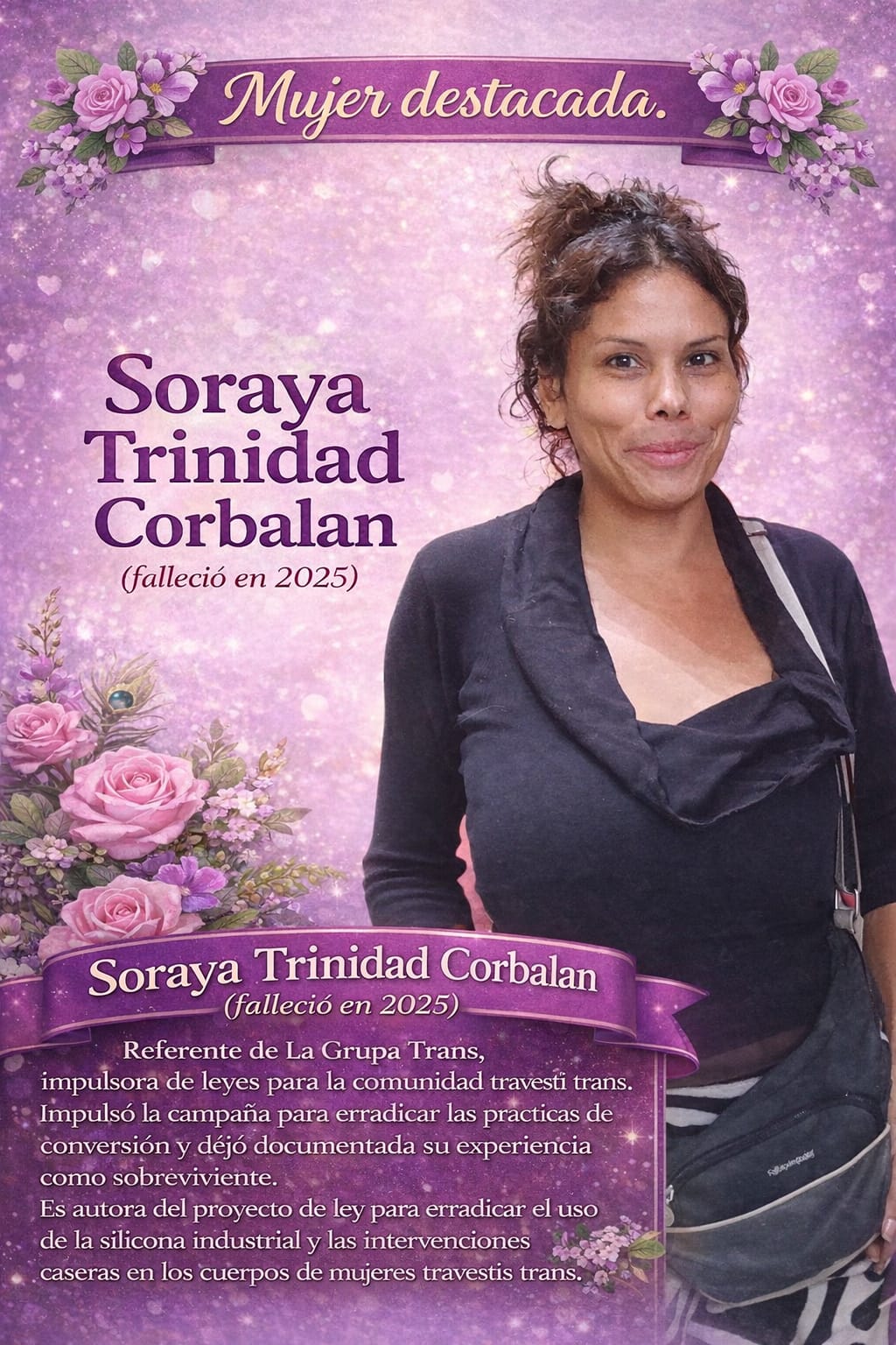 La labor y compromiso de nuestra compañera Soraya Trinida Corbalan será honrada en el mes de la mujer. Soraya Trinida Corbalan (falleció en 2025). Referente de La Grupa Trans, impulsora de leyes para la comunidad travesti trans. Impulsó la campaña para erradicar las prácticas de conversión y dejó documentada su experiencia como sobreviviente. Es autora del proyecto de ley para erradicar el uso de la silicona industrial y las intervenciones caseras en los cuerpos de mujeres travestis trans.